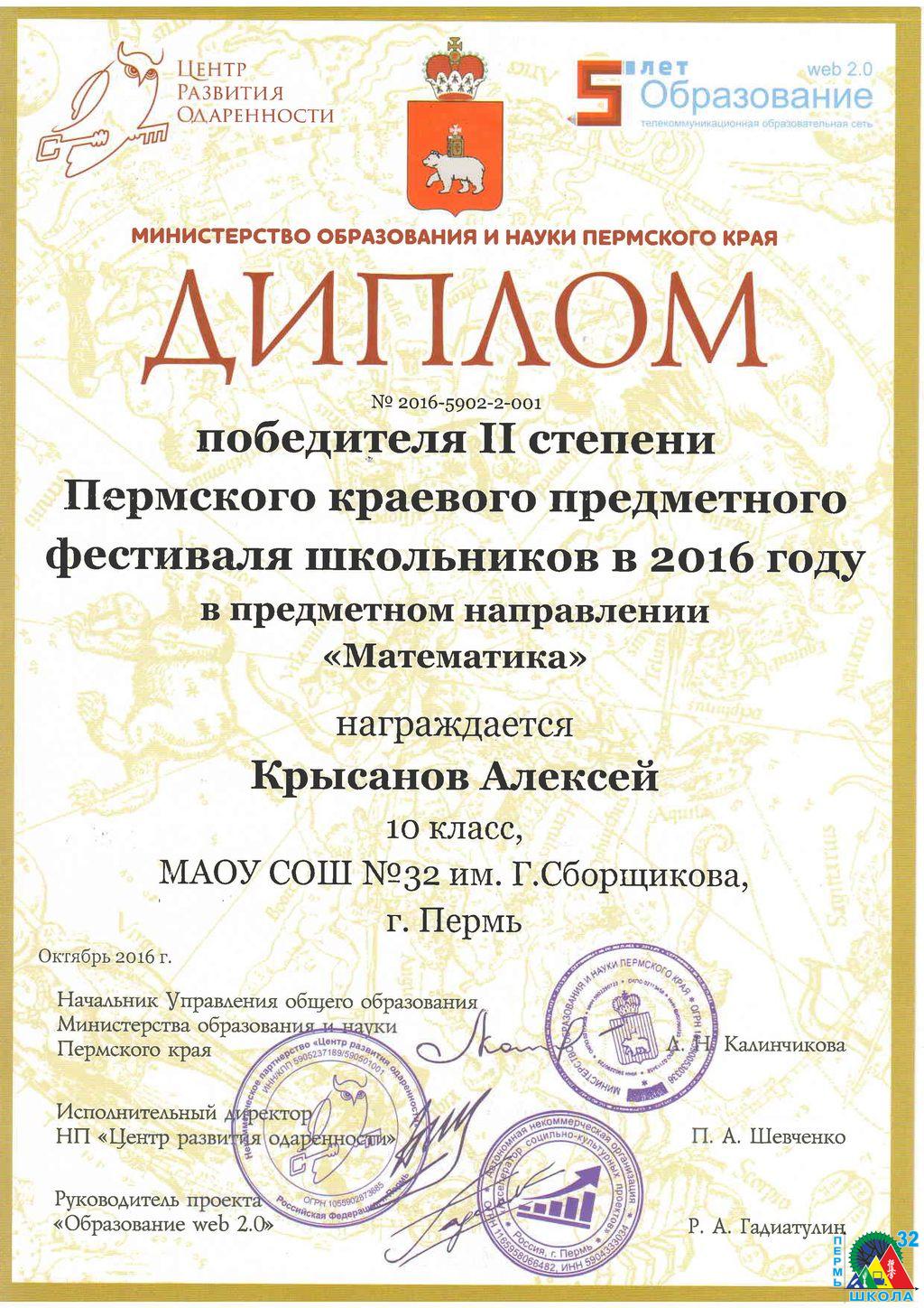С 12 по 24 сентября 2016 года при поддержке Министерства образования и науки Пермского края портал «Образование web 2.0», некоммерческое партнерство «Центр развития одаренности» и АНО «Акселератор социально-культурных проектов» организовали Пермский краевой предметный фестиваль школьников. Фестиваль проводился для учащихся 4-11 классов по двум предметным направлениям: «Математика» и «Русский язык, литература и языкознание».