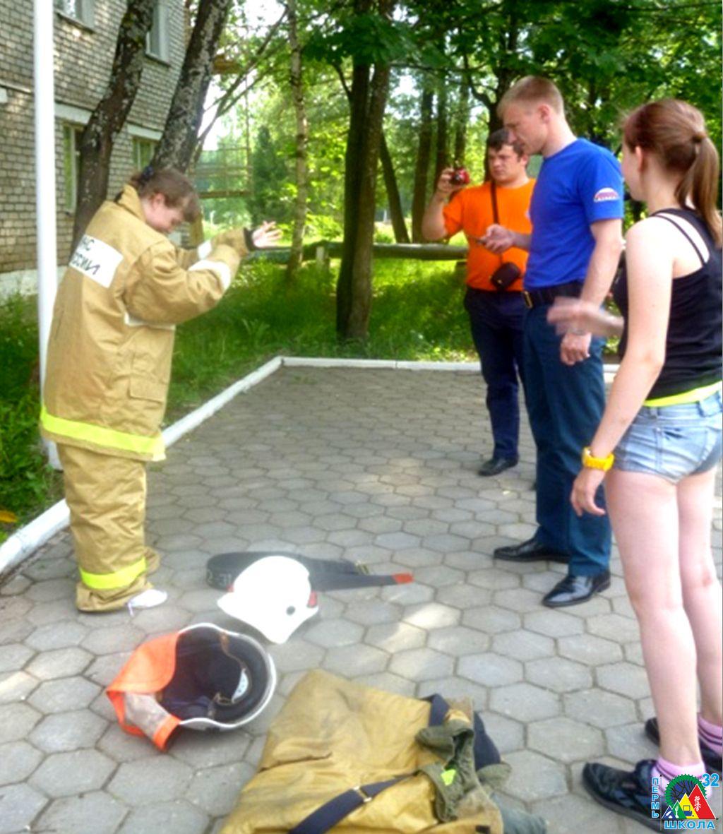 Четвертая точка была посвящена противопожарной и химической защите. Здесь ребята примерили костюмы Л-1 и костюм пожарного, подержали в руках приборы пожарного и побеседовали о сложных задачах на пожаре и способах их решения.