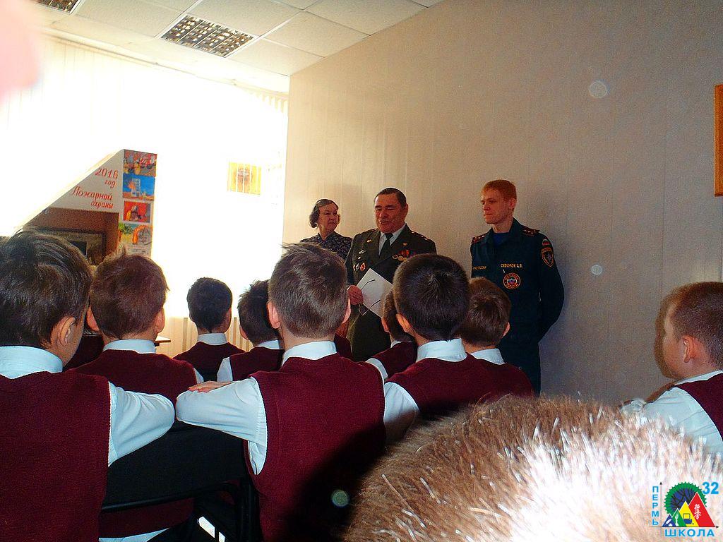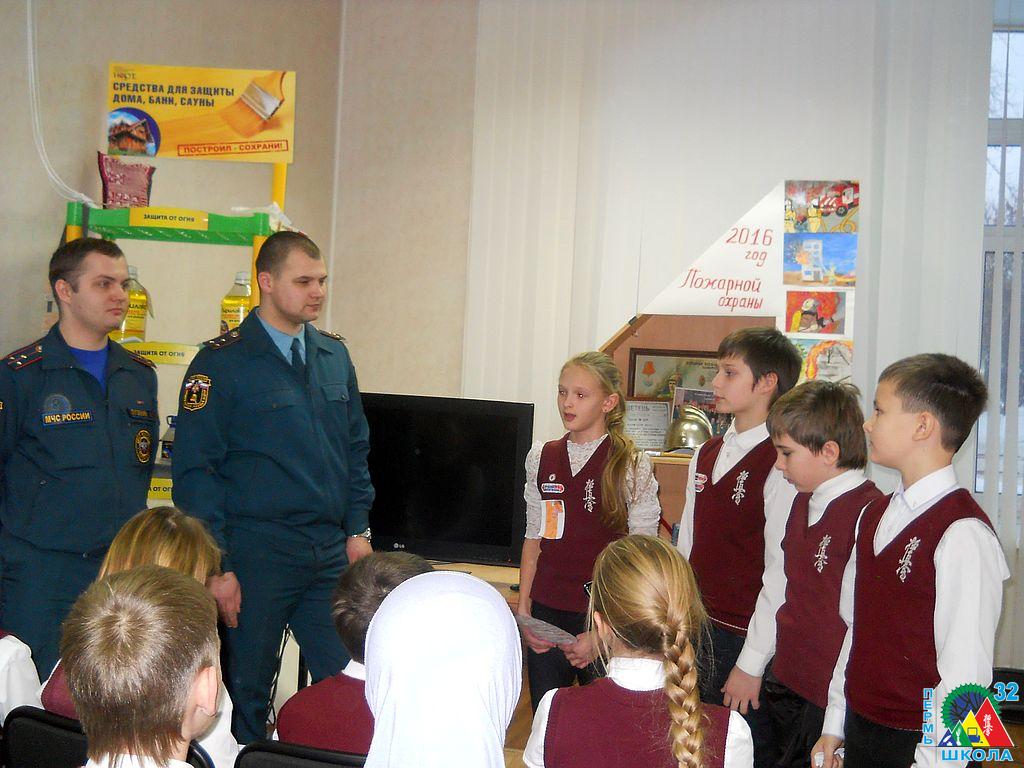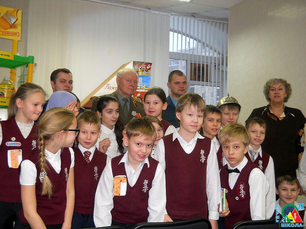 Учащиеся школы № 32 продолжают добрую традицию поздравления служащих МЧС с их профессиональным праздником. 26 декабря в канун Дня спасателя учащиеся 4 Г класса вместе с классным руководителем Ольгой Геннадьевной Каспирович и воспитателем Татьяной Владимировной Паньковой побывали в пожарной части № 1 г. Перми. Здесь ребят встречали ветеран пожарной службы М.У. Стряпунин и инспектор пожарной безопасности А.П. Лузянин.