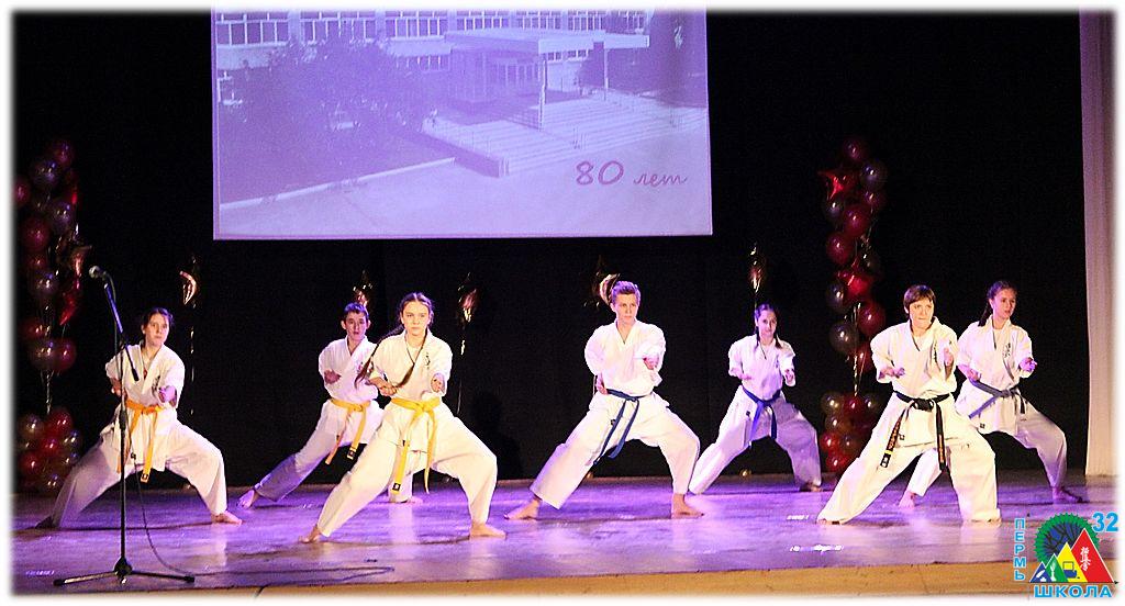 Украсили торжественную программу показательные выступления воспитанников спортивных классов киокушинкай каратэ и черлидинга, а также творческие номера в исполнении учеников и выпускников 32-ой. Среди них яркие танцевальные номера образцового детского коллектива хореографического ансамбля «Мозаика», народного ансамбля уральского танца «Камушка» и учащихся школы, занимающихся бальными танцами. Перед зрителями предстали вокальные номера в исполнении выпускников и учащихся школы, а также сводного хора 3 – 4-х спортивных классов и динамичный учительский «капустник». Два с половиной часа пролетели незаметно.