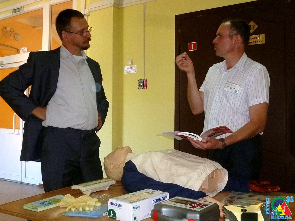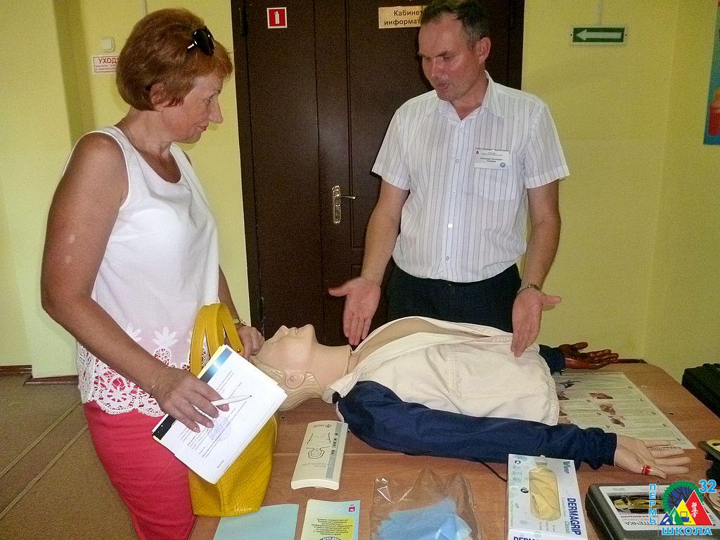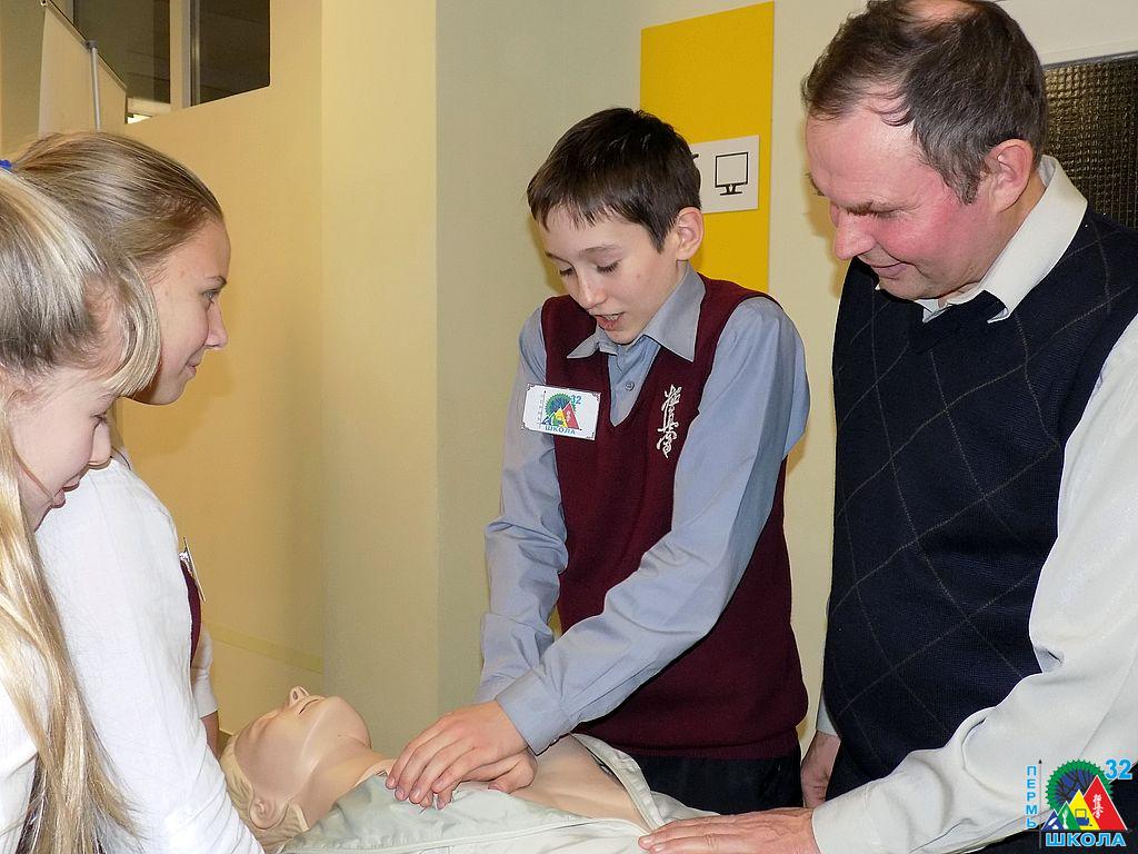 За другим столом вместе с представителем ГУ МЧС РФ по Пермскому краю учащиеся тренировались с сердечно-легочной реанимации, спасая Анну (манекен). Оказалось, что это совсем нелегкое дело: определить правильность движений помогали специальные приборы.
