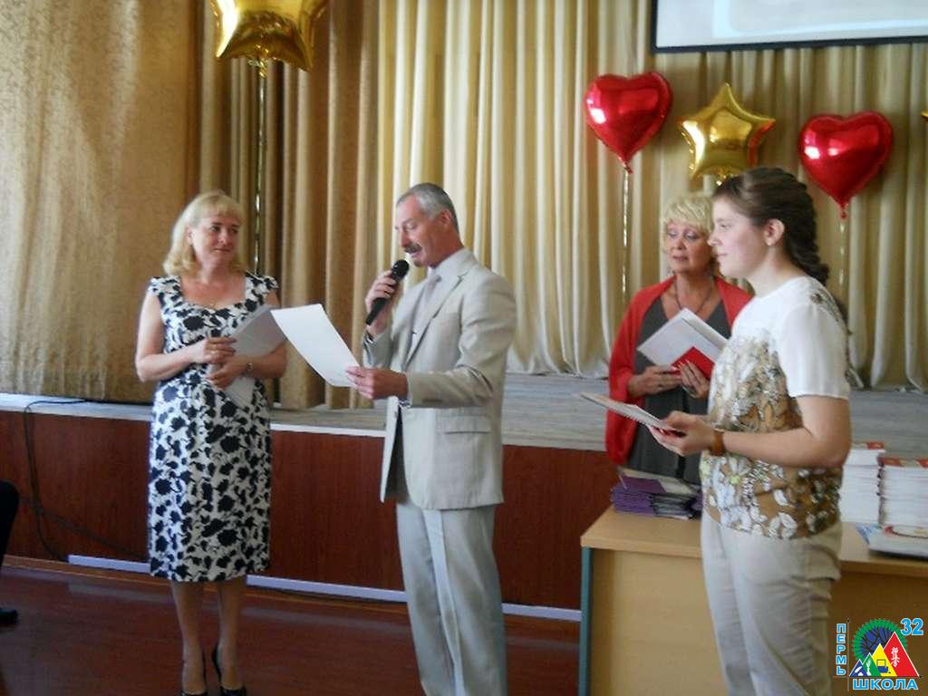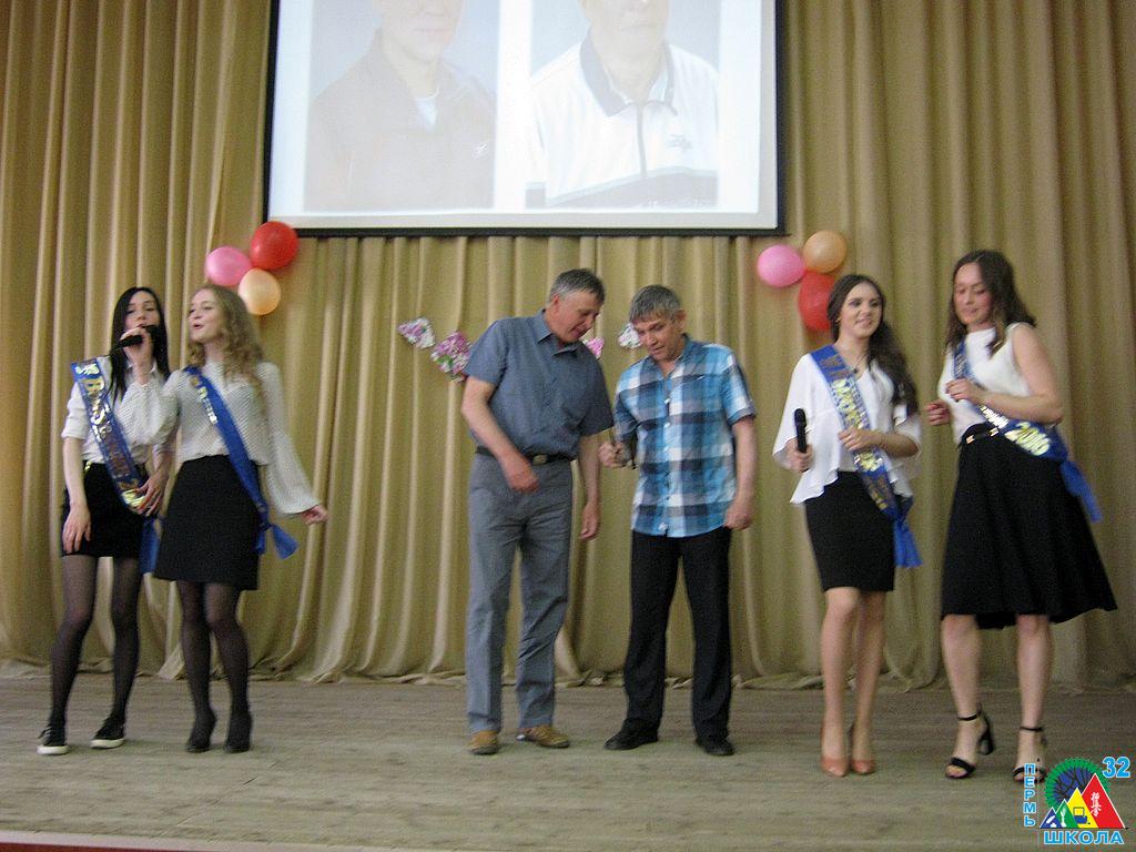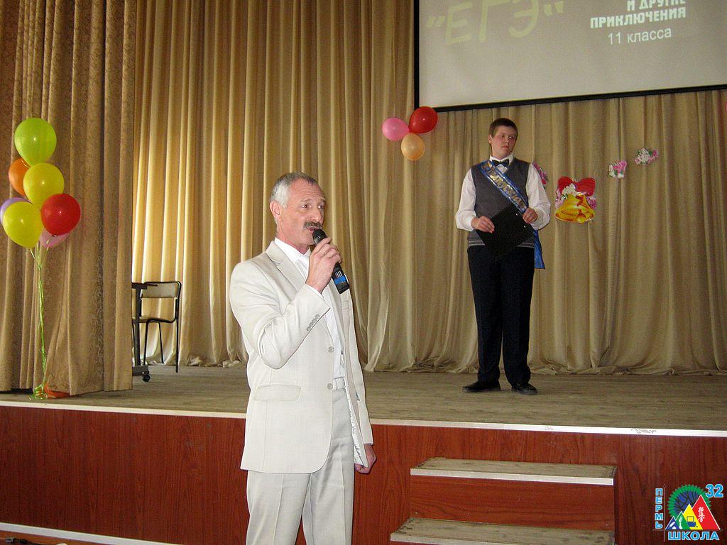 По традиции мероприятие открывал гимн Российской Федерации, затем слова приветствия и поздравлений прозвучали из уст директора школы А.М. Гликсона. Со словами поздравлений к выпускникам, родителям и учителям также обратился депутат Пермской городской думы А.С. Буторин. Далее приказ о допуске к итоговой аттестации зачитала М.А. Апалько, после чего на сцене показались сами выпускники.