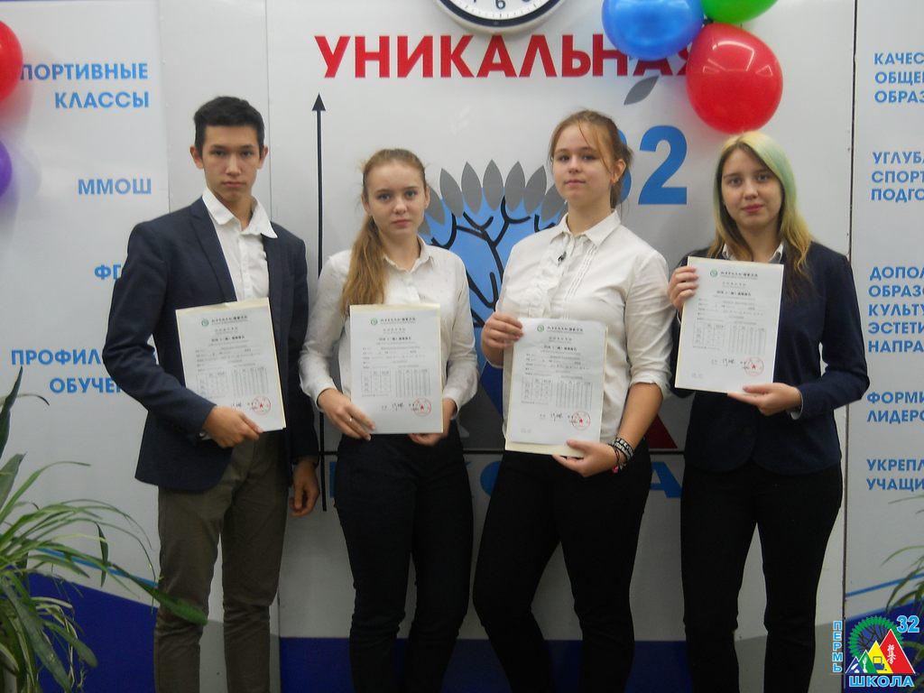 Начало октября стало знаменательным для учеников 10С (спортивного) класса. В гимназии № 2 нашим ребятам в торжественной обстановке были вручены сертификаты о том, что они успешно сдали Международный экзамен по китайскому языку (2 уровень). Этот международный экзамен проходил одновременно во всем мире 19 марта 2017 года и представлял собой аудирование и работу с текстом (письмо). Проходной балл в этом году составил 120 баллов. Учащиеся 32-ой школы отлично справились с поставленной задачей.