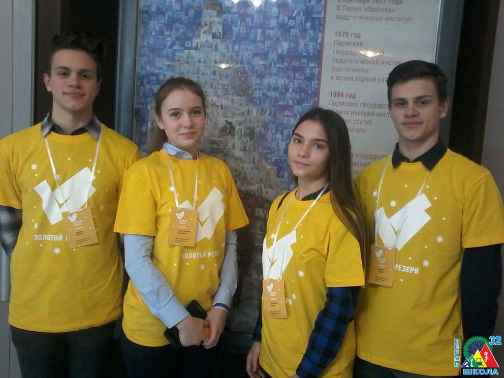 Екатерина Веретенникова (10С), Карина Дикушина (8С), а также братья Кирилл и Михаил Ивановы (9А) вошли в число трехсот наиболее активных школьников Перми. Итоги конкурса подведены по результатам исследования электронных портфолио учеников 8-11 классов. Рейтинг составляется фондом поддержки талантливой молодежи "Золотой резерв" с 2017. Все четверо ребят - яркие, разносторонние и целеустремленные молодые люди.